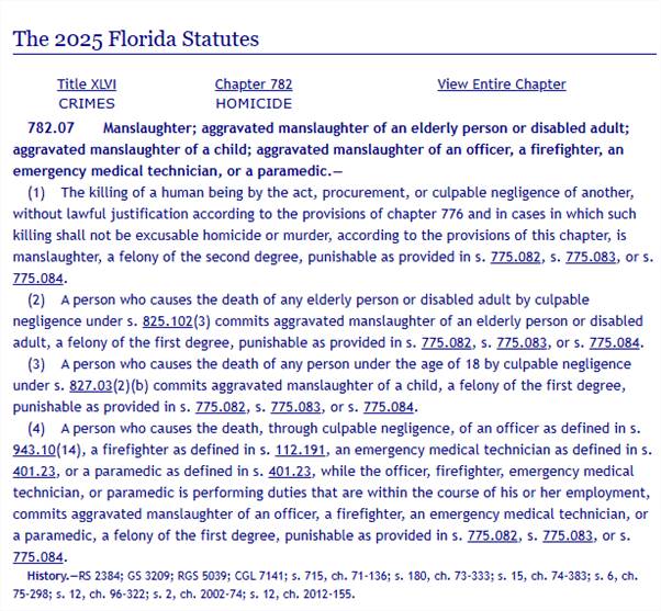 Cuando se involucra la muerte, los fiscales pueden evaluar si los hechos se ajustan al homicidio involuntario. El estatuto de homicidio involuntario de Florida incluye muertes causadas por acto, procuración o negligencia culpable, y enmarca el homicidio involuntario como una muerte sin justificación legal y no homicidio excusable o asesinato bajo la ley de Florida. Ese marco estatutario es la razón por la cual estos casos a menudo se convierten en disputas sobre clasificación, causación y si la evidencia realmente respalda el umbral penal.